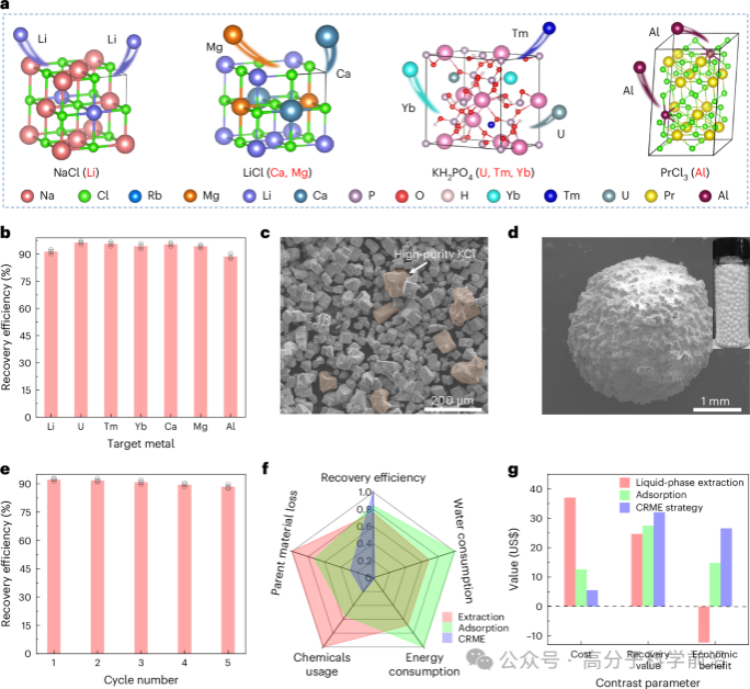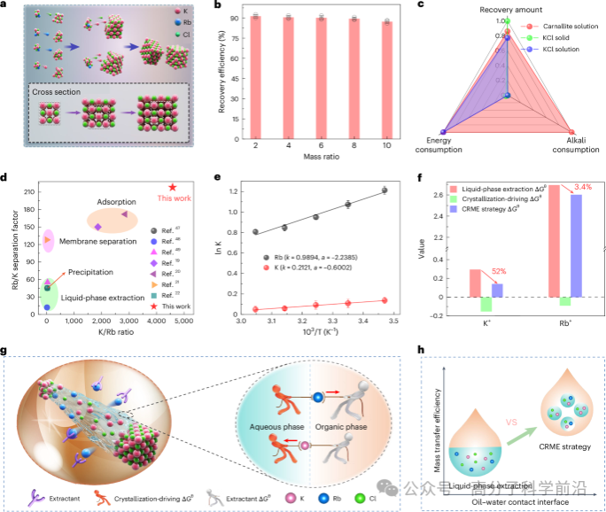 在探讨转移质量与目标离子释放效率的关系时,尽管CRME策略接近理论释放效率(98.53%),但实验中实际达成87.50%仍具有挑战。通过引入大颗粒高纯KCl来优化CRME策略(图3a),实现了小颗粒工业级KCl向大颗粒的早期传质并提高Rb释放效率。当工业级KCl与高纯KCl的质量比为2:1时,传质达到100%的理论释放效率,实验回收率为92.37%(图3b)。相比传统液相萃取法,CRME策略的水/KCl盐质量比降低至液相萃取的1/41.14,能耗减少97.85%,Rb回收率提高22.24%(图3c)。此外,CRME策略表现出更优的Rb/K分离因子(281.35),为液相萃取法的13.46倍,展现了更高的离子选择性(图3d)。这一策略不仅提升了铷回收率,还改善了KCl盐的纯度和粒度,Rb回收后的KCl盐自组装形成高品质球形颗粒。