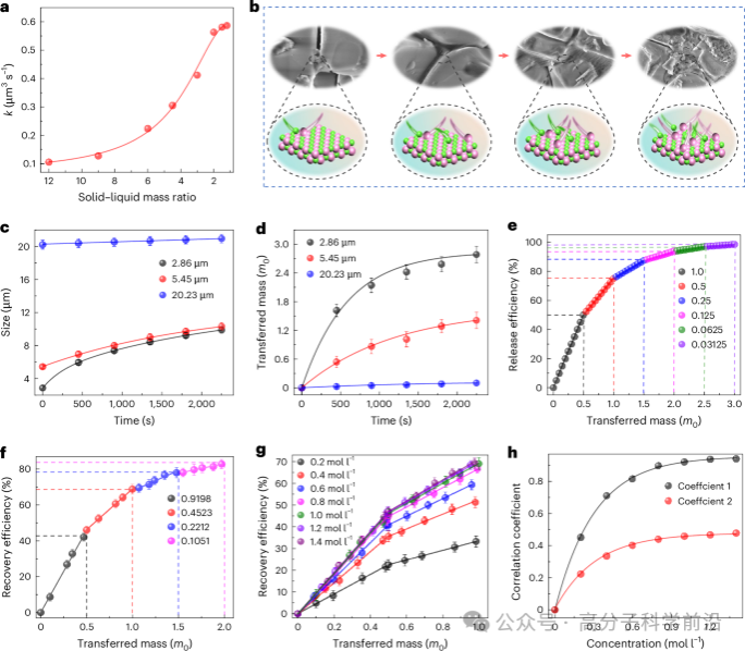 为了验证设计的可行性,作者从盐湖光卤石中制备了三种不同粒径的 KCl 样品(图 1),使用磺化煤油作为分散剂,t-BAMBP 作为萃取剂,采用 CRME 策略从固体 KCl 中回收 Rb。该策略通过诱导奥斯特瓦尔德熟化实现离子释放及传质。传质系数(k)是影响传质效率的关键,实验证实了降低固体盐与饱和溶液的质量比(SLR)可以提高 k 值至 0.58 μm³/s,说明 SLR=2 时传质效率最佳(图 2a)。作者将熟化过程分为多个阶段,发现小粒径 KCl 更有利于快速传质,而较大晶体需更长时间才能达到相同的转移质量(图 2c、d)。此外,通过萃取剂浓度优化(图 2g、h),发现浓度 1.0 mol/l 以上的系统可实现高效捕获,并验证了释放效率与传质质量的依赖关系。