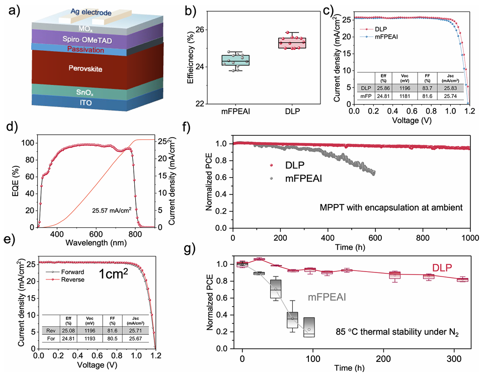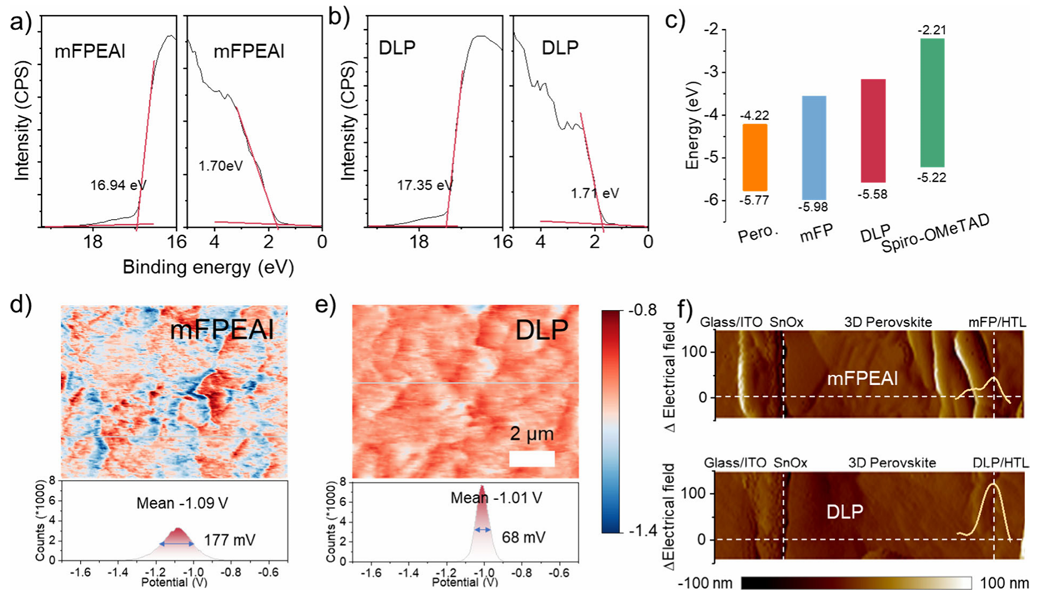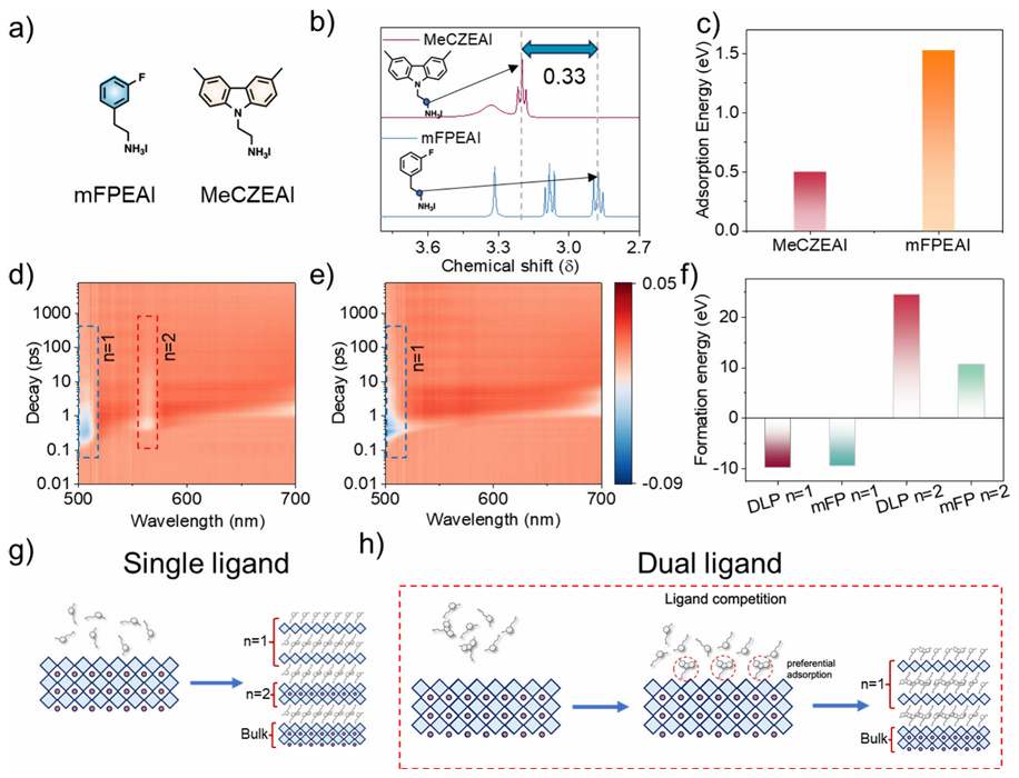 利用2D/3D堆叠异质结构的表面钝化已广泛用于提高正式钙钛矿太阳能电池的效率。然而,2D钙钛矿无序的量子阱宽度分布导致能量景观不均匀和晶体不稳定,限制了正式钙钛矿太阳能电池的进一步发展。鉴于此,2024年12月19日天津大学胡文平&新加坡国立大学侯毅于JACS刊发配体介导的表面反应实现高效钙钛矿太阳能电池中的纯二维相钝化的研究成果,开发了一种通用方法,即配体介导的表面钝化,通过双配体共沉积产生具有均匀能量景观的相纯2D钙钛矿钝化层。具有大分子尺寸和较低吸附能的3,6-二甲基咔唑-9-乙基碘化铵的优先吸附可以调节间氟苯乙基碘化铵和钙钛矿表面之间的表面反应,从而产生具有窄量子阱分布和均匀表面电位分布的2D钙钛矿。此外,表面限域的2D钝化层的保留使钙钛矿和空穴传输层界面处的电场保持较高。因此,冠军器件的效率在0.05 cm2器件中达到 25.86%,在1 cm2器件中达到25.08%,并且具有增强的运行稳定性(T90 > 1000 小时)和更好的热稳定性。该工作为钙钛矿太阳能电池的高效稳定二维钝化提供了更深入的见解。