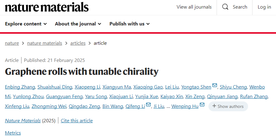 手性是一个基本特性,广泛影响化学、物理和材料科学等多个领域。从无手性的石墨烯和其他二维范德华材料中产生手性,成为了一个引人注目的研究方向,展现了出色的特性和潜在应用,如增强的光学活性、可调的电子性能和选择性的化学反应性。此外,二维材料的手性还促进了新型物理现象的出现,比如拓扑效应和非常规量子行为,这些现象具有巨大的潜力,能够推动基础科学理解和技术创新。然而,将手性引入二维材料结构中仍然充满挑战,当前报道的具有手性自旋电子学功能的二维手性材料相对较少。作为经典的二维材料,石墨烯因其高电导、优良的电化学稳定性和高机械强度,成为手性自旋电子设备的理想候选材料。通过特定角度的滚动,能够将手性引入二维材料中,但由于缺乏普适的手性滚动方法,关于手性石墨烯卷的实验研究仍然非常有限,甚至在其他材料的手性滚动结构方面也缺乏相关研究。在此,天津大学胡文平教授、雷圣宾教授、李奇峰教授和沈永涛副教授联合开发了一种通用的石蜡辅助的卷曲方法,用于制备具有可控手性的石墨烯卷,这种方法也可以推广到其他二维材料中,实现高产量生产。制备出的左旋和右旋石墨烯卷表现出显著的光学活性和优异的手性诱导自旋选择性效应,室温下的自旋极化率超过90%。通过精确控制手性角,作者能够在定制的石墨烯卷中实现可调的手性诱导自旋选择性,这一特性使其与其他碳材料或现有手性材料区分开来。狄拉克费米子模型表明,电子主要沿着手性卷曲的一侧移动,从而产生首选的自旋极化。这种手性诱导的自旋选择性效应是有限自旋选择性的结果。本方法为二维材料赋予了可调的手性特性,为量子行为的探索和室温自旋电子技术的发展提供了新的可能性。相关成果以“Graphene rolls with tunable chirality”为题发表在《Nature Materials》上,张恩冰、丁帅帅、李晓鹏、马翔云、高小青、刘磊为共同一作。