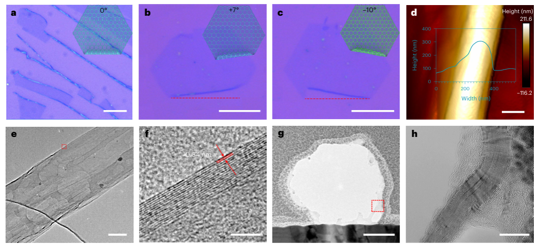 光学显微镜图像展示了典型的无手性石墨烯卷(图2a)以及角度为+7°和–10°的手性卷(图2b、c),其中独立的边缘使得滚动角度容易识别。原子力显微镜和透射电子显微镜的表征(图2d、e、g)显示,石墨烯卷具有均匀的管状结构。通过高分辨率的TEM图像(图2F)和横截面轮廓(图2h)可见,卷的壁是多层结构,层间距为0.34±0.02nm,拓扑结构由薄壁和内部的巨大空心空间构成,统计平均直径与壁比约为50–80。TEM图像进一步揭示了石墨烯层紧密缠绕形成卷(图2h),层间的π-π堆积使得石墨烯卷具备优良的结构和溶剂稳定性。扫描透射电子显微镜图像确认了石墨烯卷的手性结构,卷的不同位置晶格方向(如Zigzag方向)与卷的方向不同,进一步证明了石墨烯是沿着手性角度卷起的(图2)。