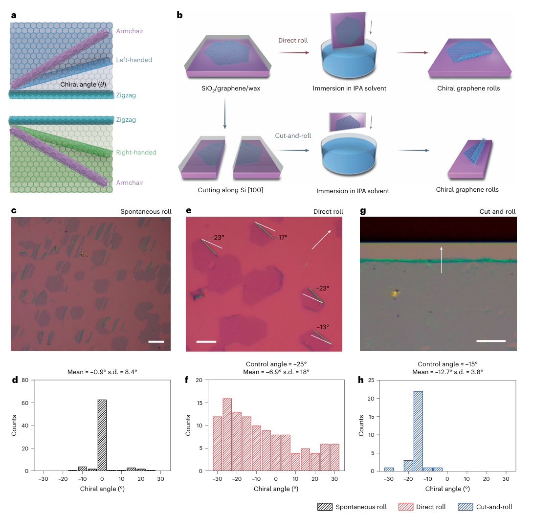 图1a展示了石墨烯滚动过程中手性的形成。当沿armchair边缘(θ=30°)或zigzag边缘(θ=0°)卷起石墨烯时,会产生无手性结构(θ表示石墨烯辊和曲折边缘之间的角度)。在0°到30°或–30°到0°的范围内滚动石墨烯,会导致手性结构的形成,其中左手和右手手性石墨烯卷是光学不对称的对映异构体。滚动角度不仅决定了手性,还影响管状结构的电子特性。虽然已有多种方法报告了卷起二维材料,但大多数卷起结构沿着易于裂解的锯齿形边缘,因此具有不稳定性(图1c、d)。为了解决这一问题,作者开发了一种蜡辅助的浸入方法,能够以可控角度卷起石墨烯,如图1b所示。在单晶石墨烯上涂覆一层蜡,并转移到Si/SiO2底物上。在“直接滚动”过程中,通过恒定速度将蜡/石墨烯/硅样品垂直浸入异丙醇中,接触热溶剂时,表面张力会根据接触角度定向卷起(图1b)。作者发现,滚动角度对浸入速度不敏感,但对溶剂极性较为敏感。在“切割-卷曲”法中,作者使用连续的单晶石墨烯,通过沿硅的[100]轴切割来产生平坦的手性边缘,并根据角度控制手性(图1g)。此方法使得手性角的调整更精确(图1h),卷曲手性角的可控性更高。不过,直接滚动方法具有较高的收率,且能通过光学图像准确确定每个滚动的角度(图1e、f)。因此,直接滚动方法更适合用于依赖于滚动角度的光学和电子研究。