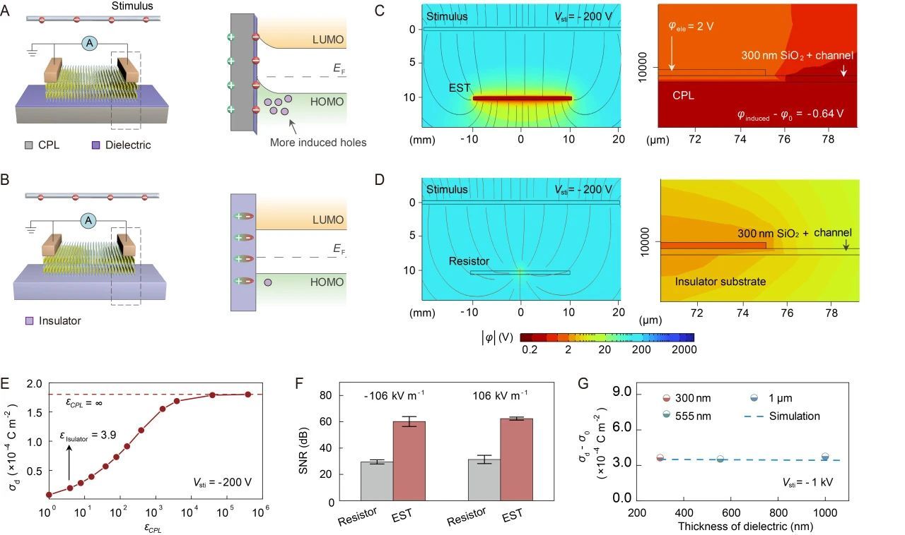该电感知晶体管(EST)模仿电感受细胞,采用有机半导体单晶膜作为空间电场门控载流子沟道,电荷泵层通过介电层与其隔离。通过引入的电荷泵层,增强了沟道中的感应电荷,提升了EST的信噪比至60 dB。