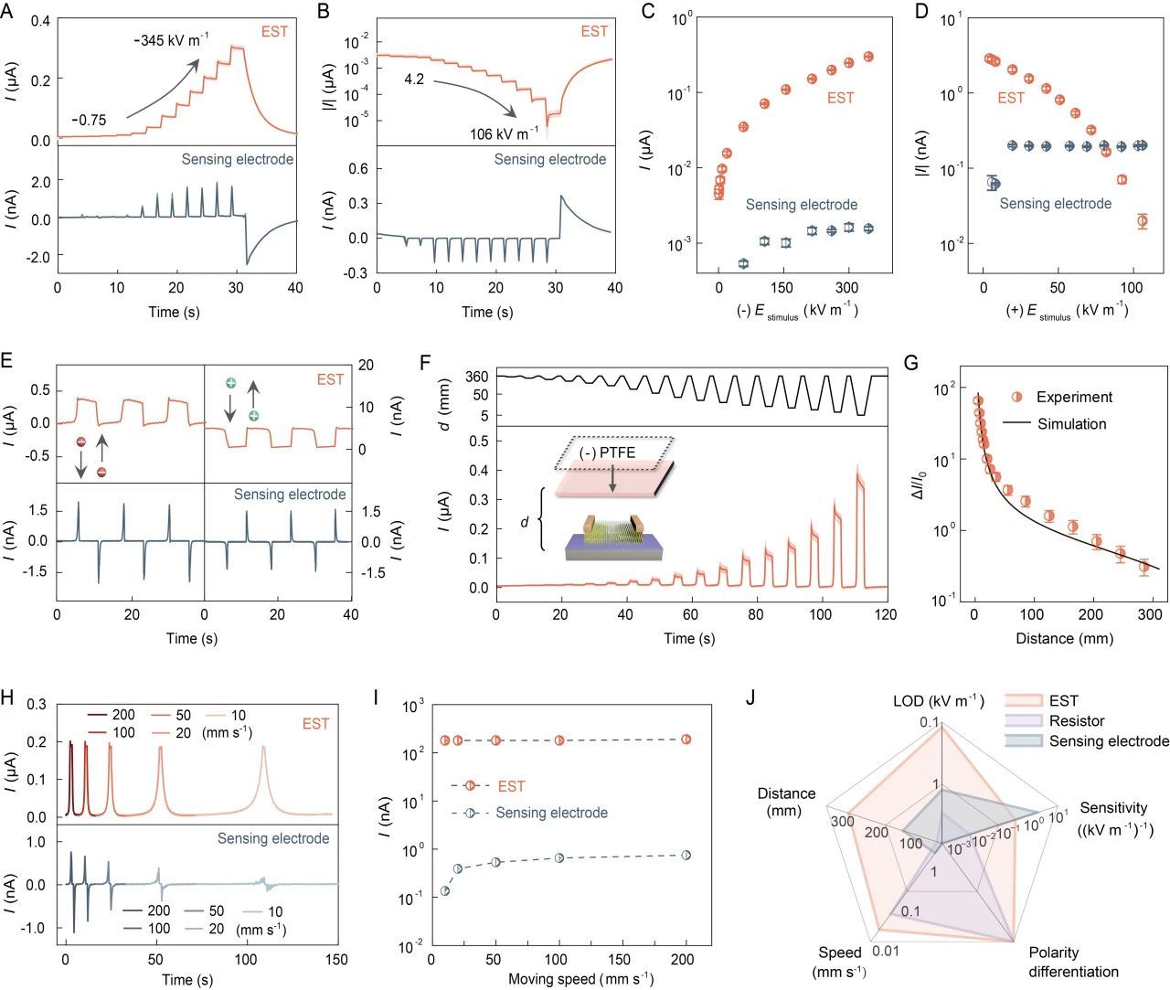 EST可检测正负双极性电场,负电场检测限为-0.12 kV/m,正电场检测限为0.61 kV/m,支持区分不同电场极性并识别带电物体的运动方向(靠近或远离),可以识别极慢速运动的带电物体(低至20 μm/s)。
