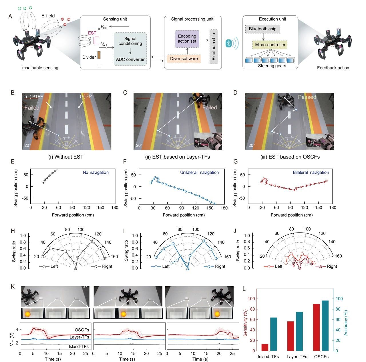 将EST集成到爬行机器人头部,使其具有电感知能力,能够根据电场信号探测隐藏物体和自主导航。EST具有优良的电磁干扰抵抗能力和能效表现,适用于复杂、恶劣或危险环境,为扩展人工系统的感知能力开辟了新途径。