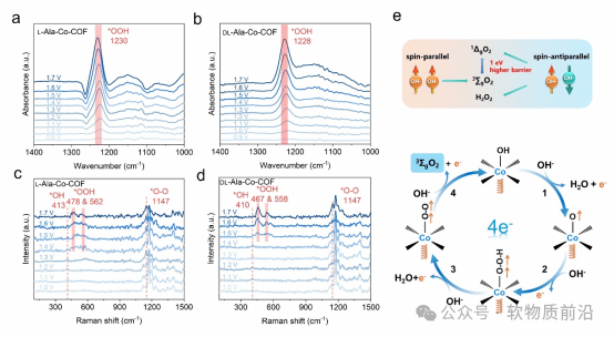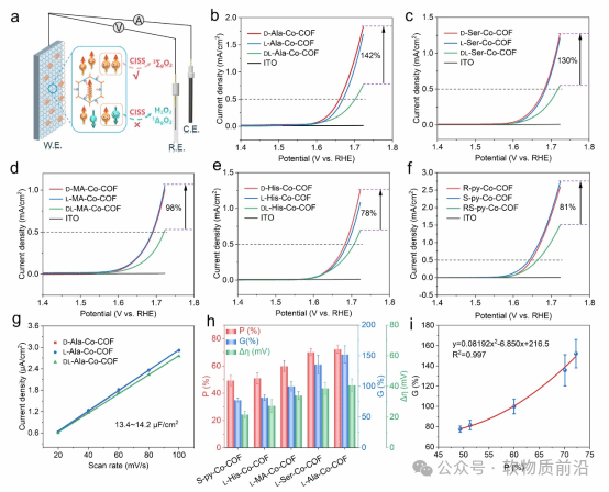 总体而言,手性共价有机框架(COFs)可以作为高效的电子自旋过滤器,在电荷通过单层手性共价有机框架(mc-COFs)时,电子自旋与其线性动量耦合,从而实现高度的自旋选择性。对于不同的mc-COFs,观察到手性诱导的超线性效应,即自旋极化与增益系数(G ∝ P⟡)之间存在显著的超线性关系,表明手性增强的氧析出反应(OER)性能随着自旋极化的程度快速增加,证实了由于手性诱导的自旋选择性(CISS)效应,手性增强的电催化性能显著放大。此外,CISS效应可以促进自旋平行的OH自由基在三重态势能面上的相互作用,从而促进在较低电位下形成自旋对齐的中间体(OOH和OO),并加速OOH向*OO的转化。因此,手性增强的OER性能得到了充分的展示,其特征是更高的电流密度、更低的过电位、更小的Tafel斜率、更低的电荷转移电阻以及在手性电极上对H₂O₂的更大抑制作用。这强调了CISS效应以及整体手性增强的OER性能在优化电催化效率方面发挥的关键作用。