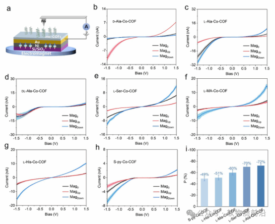 图3 单层手性/外消旋COFs的磁性导电探针AFM(mCP-AFM)测量