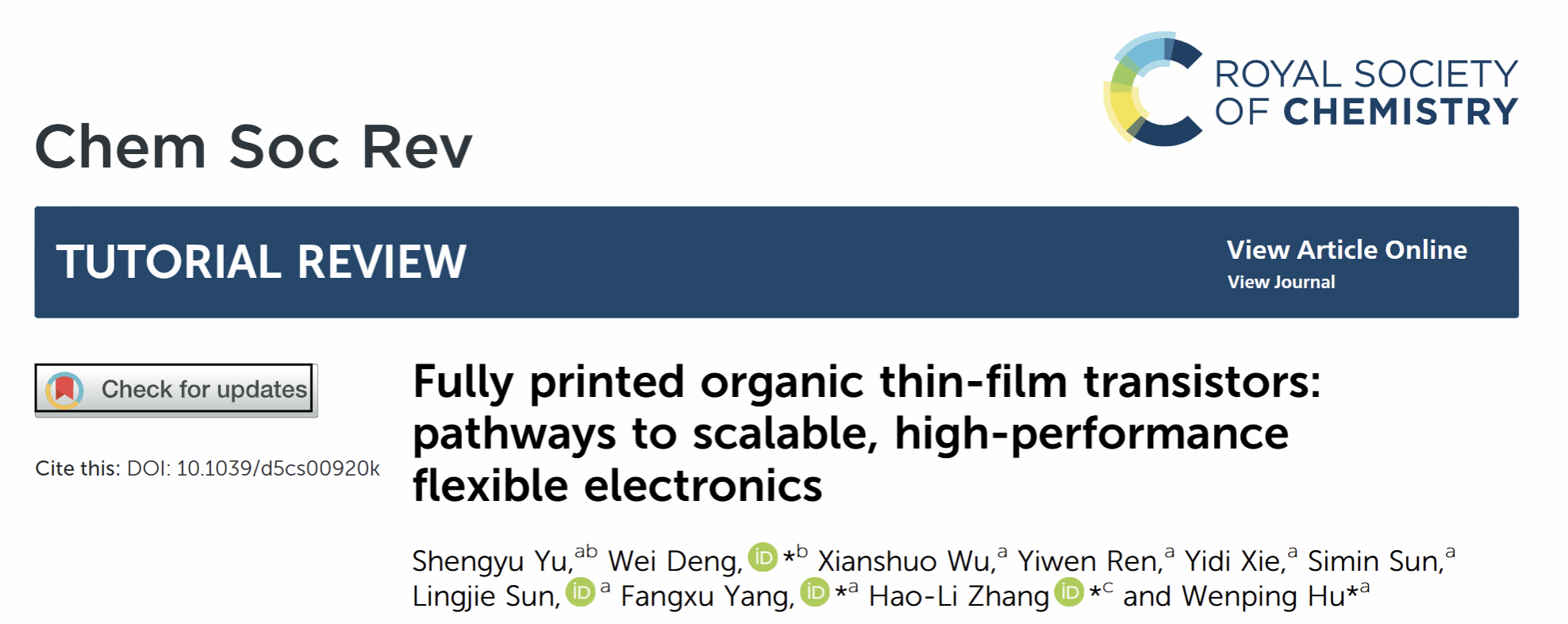 物联网(IoT)与工业4.0的发展催生了对大面积、轻量化、柔性且节能的电子设备的迫切需求,这类设备要求高吞吐量、低成本地制备可无缝集成于柔性基底的可靠晶体管与电路。有机半导体(OSCs)凭借良好的溶液加工性、柔性基底兼容性、成本优势及可扩展性,成为印刷电子的理想材料。然而,全印刷有机薄膜晶体管(OTFTs)及其集成电路的相关报道仍较为有限,从部分印刷到全印刷的技术路径尚未完全确立,面临着电性能不足、印刷分辨率低、制造效率待提升等关键挑战,亟需通过化学创新与工艺优化突破瓶颈。