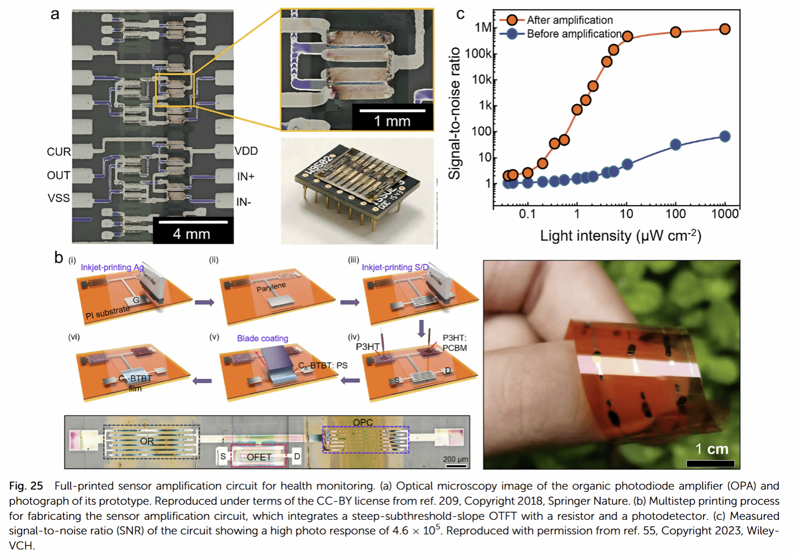 2. 全印刷有机电路包括环形振荡器、运算放大器、传感器放大电路、显示背板驱动电路及神经形态电路等。通过3D集成技术可提升晶体管密度至60 units cm⁻²,接近中规模集成水平;神经形态电路实现了低能耗图像识别与强化学习,传感器放大电路的光响应信噪比达4.6×10⁵,展现出在健康监测等领域的应用潜力。