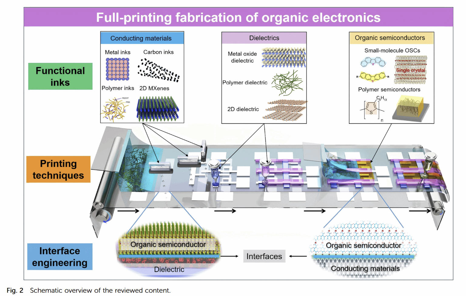 1. 系统梳理印刷有机电子的发展历程与关键里程碑,明确技术演进脉络。2. 对比分析数字与非数字两类印刷技术的原理、优势及局限性,聚焦墨水化学对工艺适配性的影响。3. 阐述分子设计、表面化学及流体动力学在提升印刷功能层质量中的核心作用。4. 从化学视角总结OTFTs通道、接触界面及电介质界面的优化方法与策略。5. 综述全印刷OTFTs及集成电路的最新进展,剖析当前技术挑战与未来发展方向。