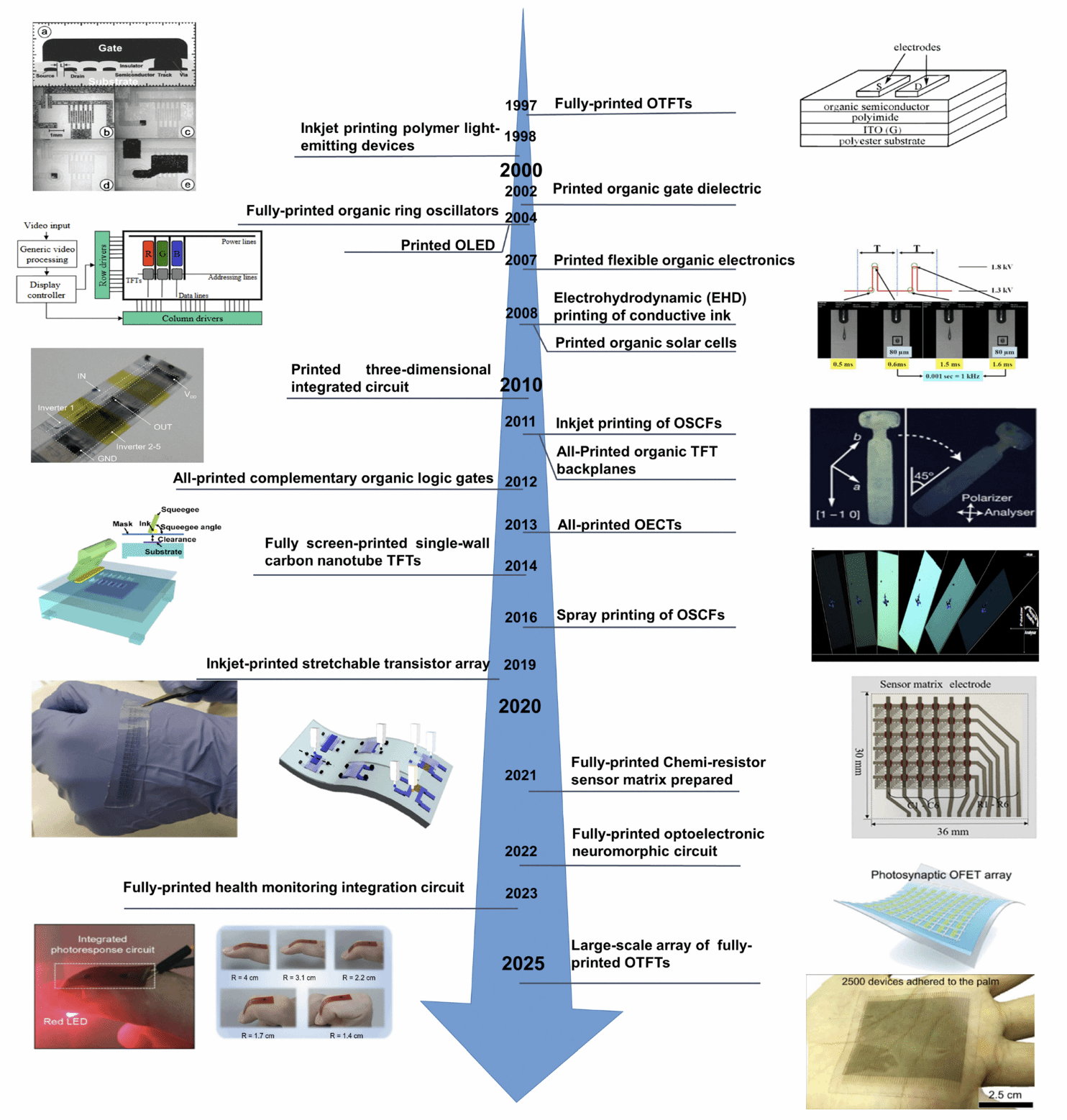 1. 全印刷OTFTs已实现从实验室原型到规模化制备的突破,1997年首次报道的丝网印刷OTFTs迁移率仅0.03 cm²V⁻¹s⁻¹,目前基于有机半导体单晶薄膜的全印刷OTFTs迁移率已达13.8 cm²V⁻¹s⁻¹,且在50%压缩应变下仍保持稳定性能。