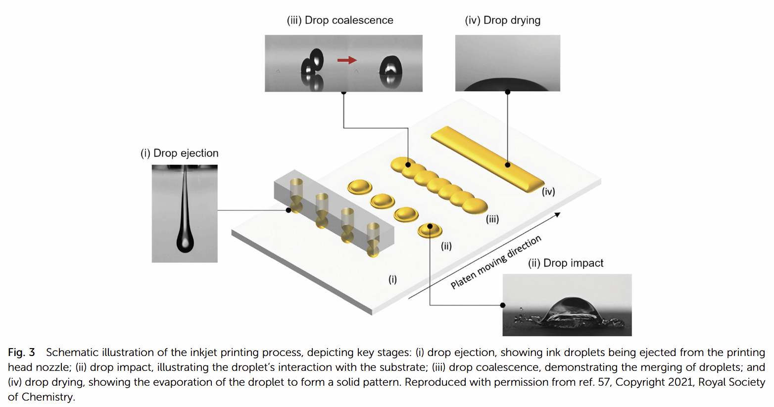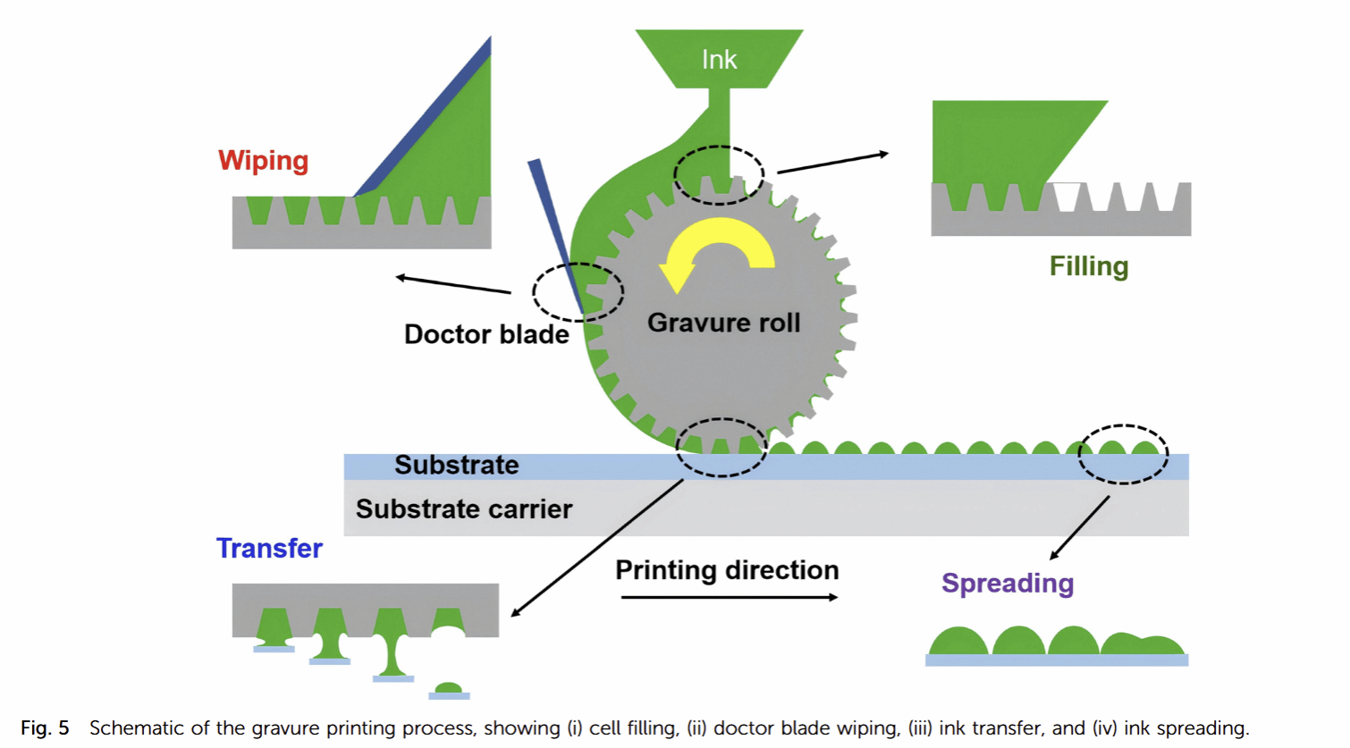 印刷技术分为数字印刷(喷墨印刷、电流体动力印刷、气溶胶喷射印刷等)与非数字印刷(凹版印刷、丝网印刷、弯月面引导印刷等)。数字印刷无需掩模,图案灵活性高,如压电喷墨印刷适配多种材料墨水,但分辨率(20-50μm)与印刷速度受限;电流体动力印刷(EHD)可实现1-3μm的高分辨率,是高集成电子器件的潜力技术。非数字印刷更适用于大规模高通量制造,如凹版印刷分辨率可达5-20μm,丝网印刷适配高粘度墨水,利于多层结构对齐,但分辨率相对较低(>30μm)。各类技术在墨水粘度、分辨率、吞吐量等方面各有优劣,需根据器件需求组合选用。