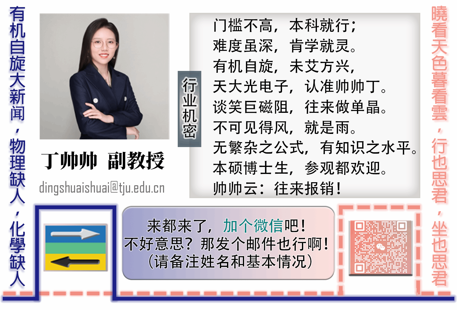 课题组常年欢迎具有物理、化学、材料、半导体、微电子等相关学科背景的博士研究生、硕士研究生以及高年级本科生垂询加盟。组内学生将按照天津大学相关规定给予有竞争力的生活补助及科研奖励,表现优秀者将有机会被推荐到国内外一流高校及研究机构进行深造。欢迎有志于有机自旋电子学研究的同学们邮件联系(dingshuaishuai@tju.edu.cn)。如有兴趣,欢迎大家到实验室参观并参加组会以考察我和本组在读学生的水平和人品。以下是自制招生广告,欢迎转发和垂询。