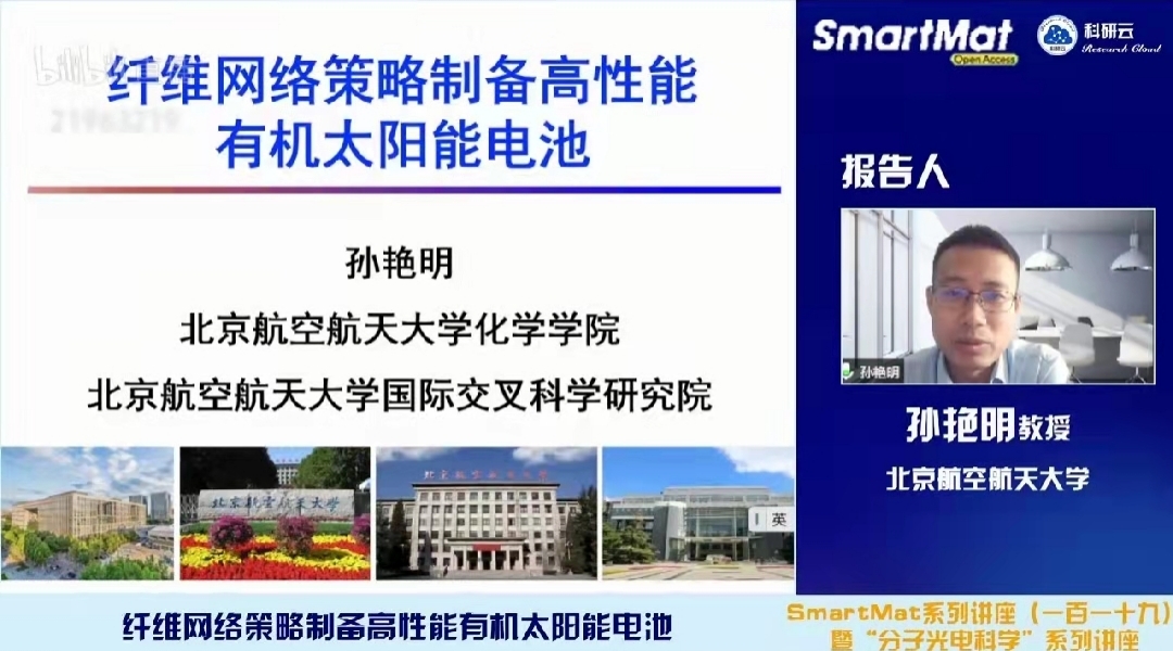 2022年4月6日,受天津大学胡文平教授及香港城市大学张华教授邀请,北京航空航天大学孙艳明教授通过bilibili(哔哩哔哩)、百度、YouTube等直播平台同步直播了题为“纤维网络策略制备高性能有机太阳能电池”的学术报告。