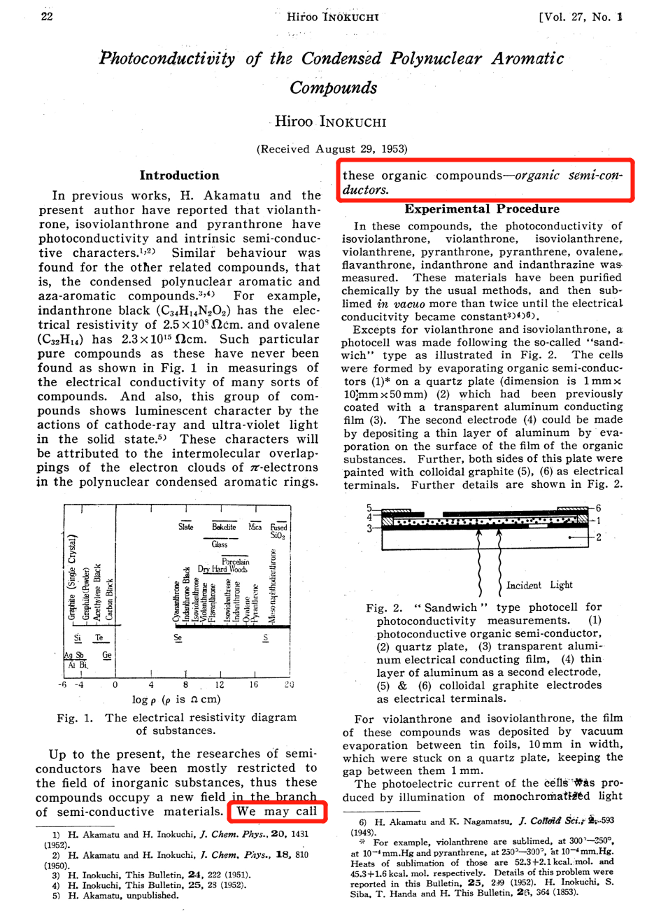 [2] Hiroo Inokuchi, Photoconductivity of the Condensed Polynuclear Aromatic Compounds, Bull. Chem. Soc. Jpn. 1954, 27,22. DOI:10.1246/bcsj.27.22