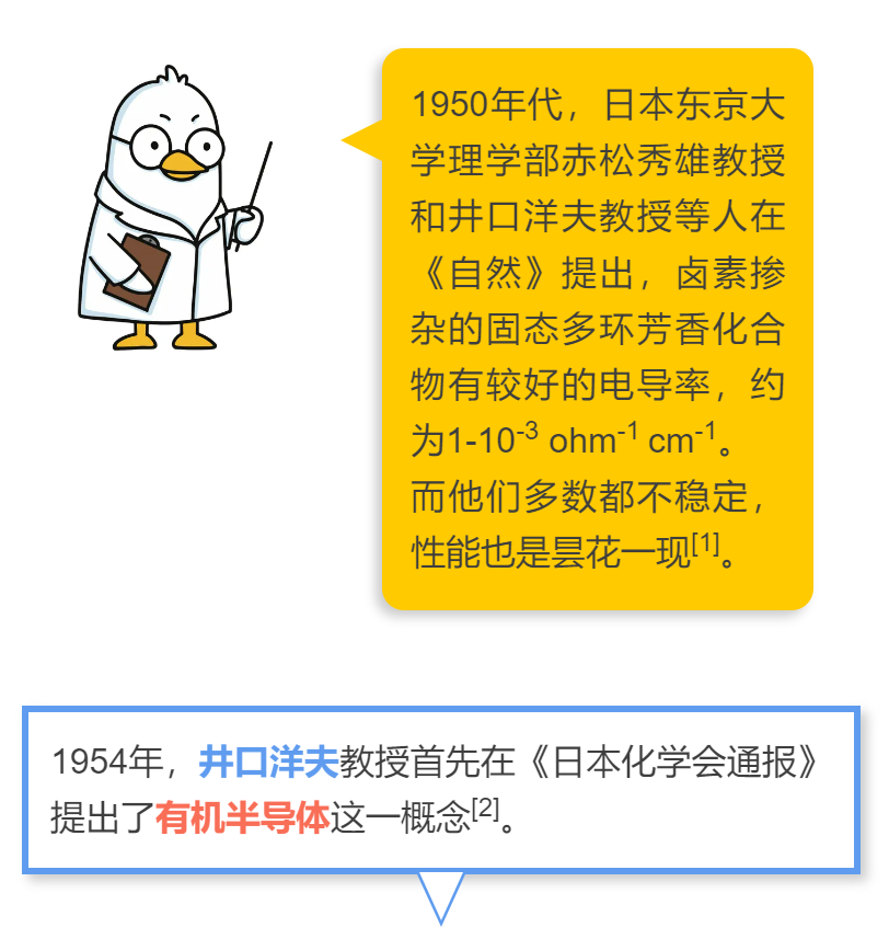 [1] Hideo Akamatu, Hiroo Inokuchi and Yoshio Matsunaga, Electrical Conductivity of the Perylene–Bromine Complex, Nature 1954, 173, 168-169. DOI:10.1038/173168a0