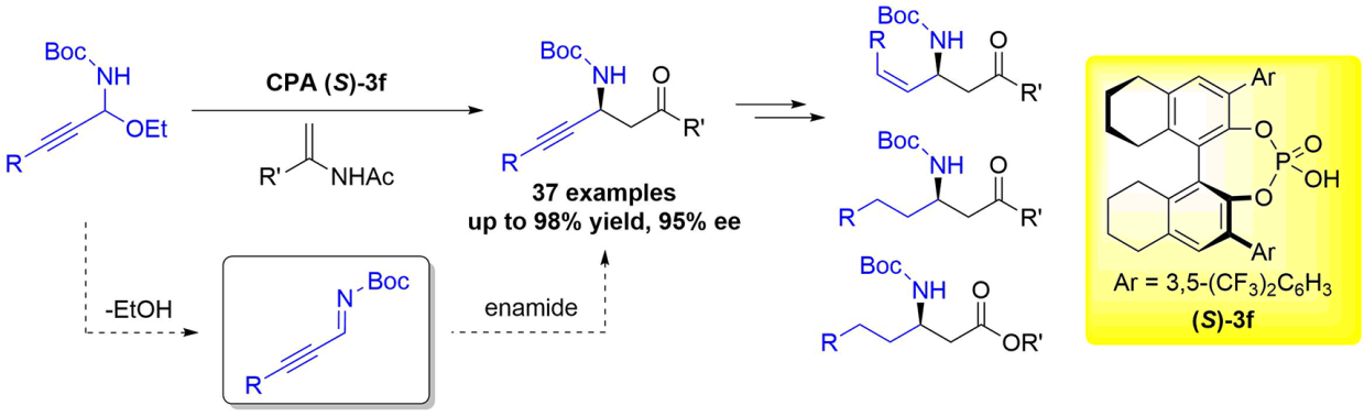 [15] Fang-Fang Feng, Shen Li, Chi Wai Cheung*, and Jun-An Ma*. Chiral β‑Keto Propargylamine Synthesis via Enantioselective Mannich Reaction of Enamides with C‑Alkynyl N‑Boc N,O‑Acetals[J]. Org. Lett. 2019. DOI: 10.1021/acs.orglett.9b03181