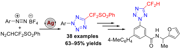 [11] Xing Peng, Ming-Yang Xiao, Jun-Liang Zeng, Fa-Guang Zhang*, and Jun-An Ma*. Construction of Difluoromethylated Tetrazoles via Silver-Catalyzed Regioselective [3 + 2] Cycloadditions of Aryl Diazonium Salts[J]. Org. Lett. 2019, 21, 4808-4811. DOI: 10.1021/acs.orglett.9b01697