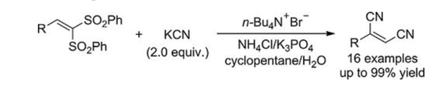 [1]Yue Zhang[a], Yi Wei[a], Shen Li*[a] and Jun-An Ma*[a]. Stereoselective One-Pot Synthesis of cis-1,2-Dicyanoalkenes from 1,1-Bis(benzenesulfonyl)alkenes and KCN[J]. Eur. J. Org. Chem. 2019. DOI: 10.1002/ejoc.201801504