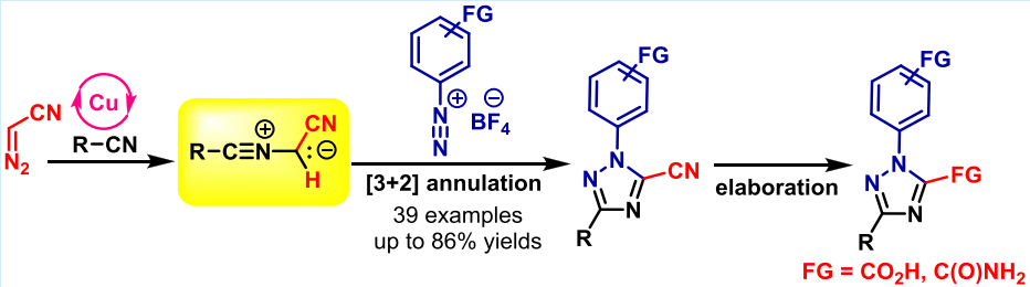 [3] Lu-Nan Zhou, Fang-Fang Feng, Chi Wai Cheung,* and Jun-An Ma*, Cu-Enabled [3 + 2] Annulation of In Situ Formed Nitrile Ylides with Aryldiazonium Salts: Access to 5‑Cyano-1,2,4-Triazoles[J]. Org. Lett. 2021, 23, 739−744. DOI: 10.1021/acs.orglett.0c03960