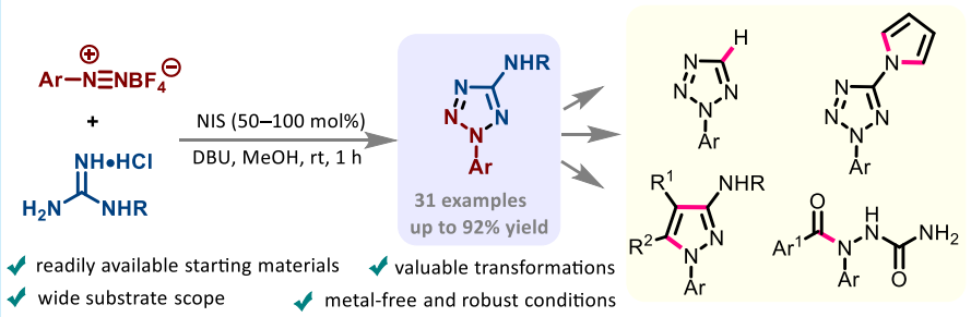 [15] N Iodosuccinimide-Promoted [3 + 2] Annulation Reaction of Aryldiazonium Salts with Guanidines To Construct Aminotetrazoles. Org. Lett. 2021, 23, 8894−8898. https://doi.org/10.1021/acs.orglett.1c03395