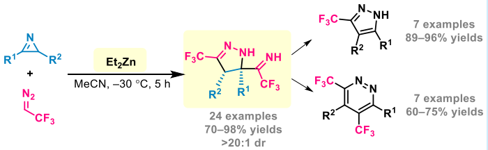 [13] Yue-Ji Chen, Fa-Guang Zhang,* and Jun-An Ma*. Zinc-Enabled Annulation of Triflfluorodiazoethane with 2H Azirines to Construct Triflfluoromethyl Pyrazolines, Pyrazoles, and Pyridazines. Org. Lett. 2021, 23, 6062−6066. https://doi.org/10.1021/acs.orglett.1c02139