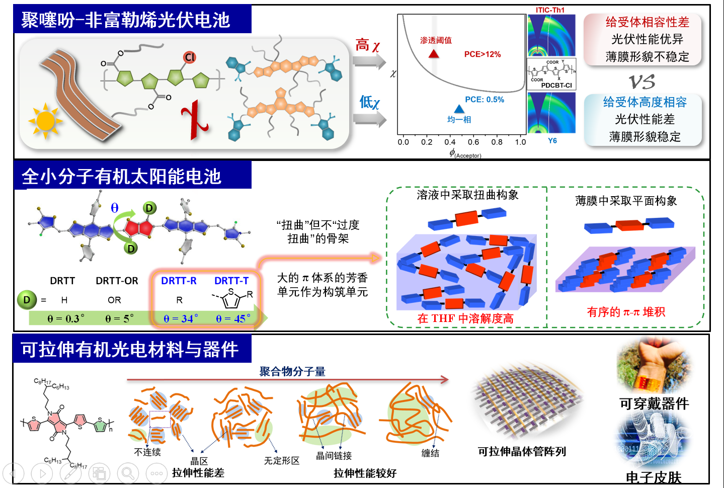 团队以光电和能源功能高分子为基础,剑指国家战略性先进电子材料,发展具有应用潜能和自主知识产权的高性能、低成本的新材料和器件体系。迄今为止,已成功开发了一系列具有高迁移率和高能量转换效率的有机高分子功能材料。