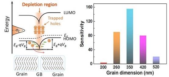 图1.左:偏置电压下有机半导体晶界处的能带模型示意图。右:电荷输运的温度灵敏度与晶粒尺寸关系的条形图。(灵敏度定义为从25℃到85℃的电流变化率)。