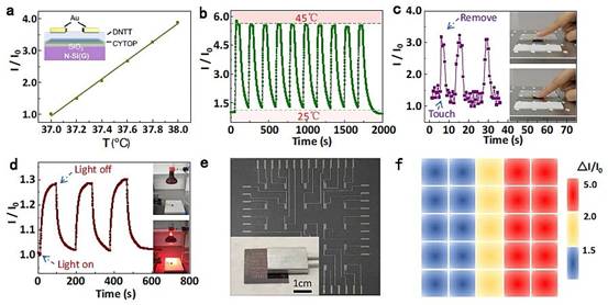 图2.温度传感器的示范性应用。a传感器的温度分辨率达0.2°C。b温度传感器的循环稳定性。c温度传感器对手指触摸的响应。d温度传感器对红外热源的响应。e OFET温度传感器阵列的照片。f传感器阵列测得的温度分布图。