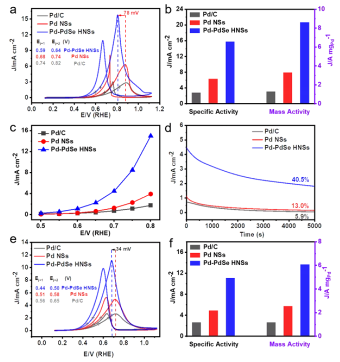 本文在碱性介质中考察了Pd-PdSe HNSs对乙二醇的催化性能。同时选择Pd NSs和工业Pd/C作为参比催化剂。通过比较不同催化剂在N2饱和碱性溶液中的EGOR循环伏安曲线。Pd-PdSe HNSs的比活性(质量活性)为15.7 mA cm-2 (8.6 A mg-1),表现出最高的催化活性,是Pd NSs和商业Pd/C的2.5 (2.6)和5.5 (6.6)倍(图3b)。在2000个CV循环后,这些催化剂的活性都有不同程度的下降。Pd/C和Pd NSs的比活性仅比初始电流保持52.4%和64.6%,明显低于Pd-PdSe HNSs (77.3%)。除了EGOR,Pd-PdSe HNSs同样表现出了优越的EOR性能,Pd-PdSe HNSs的比活性(质量活性)分别是商用Pd/C和Pd NSs的4.2 (5.1)和3.2 (2.0)倍(图3e,f)。