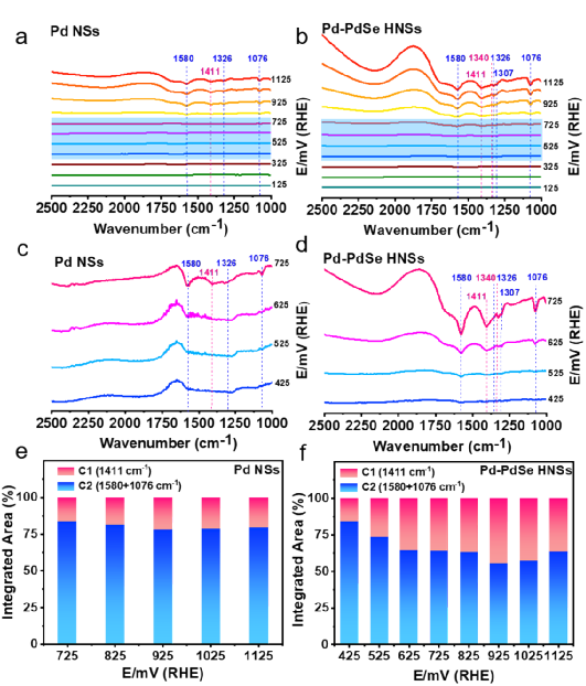 图4. a,c)Pd NSs和b,d) Pd-PdSe HNSs的电化学原位FTIR光谱;e) Pd NSs和f) Pd-PdSe HNSs在不同电压下的产物分布。