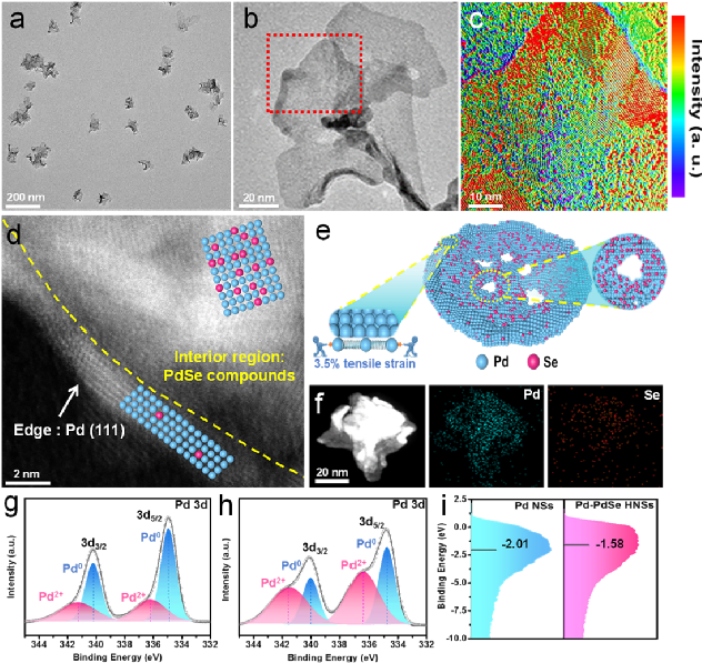 图2. a, b)不同放大倍数的Pd-PdSe HNSs的TEM图像;c)取自(b)中红色虚线正方形的彩色模拟图;d) Pd-PdSe HNSs的球差电镜图片;e) Pd-PdSe HNSs结构示意图;f) Pd-PdSe HNSs的HAADF-STEM和EDS映射图像;(g) Pd NSs和(h) Pd-PdSe HNSs的Pd-3d XPS谱;i) Pd NSs和Pd-PdSe HNSs的表面价带谱。