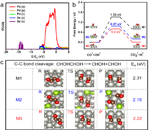 图5. a) Se掺杂Pd(111)表面的PDOS;b)在EGOR过程中,在三种不同的模型表面(M)上,OH*助氧化CO*生成CO2的反应能垒;C) C-C键断裂的活化能和反应物(R)、过渡态(TS)和产物(P)的结构模型。M1为纯Pd(111)面,M2为Se掺杂Pd(111)面,M3为拉伸应变为3.5%的Pd(111)面。