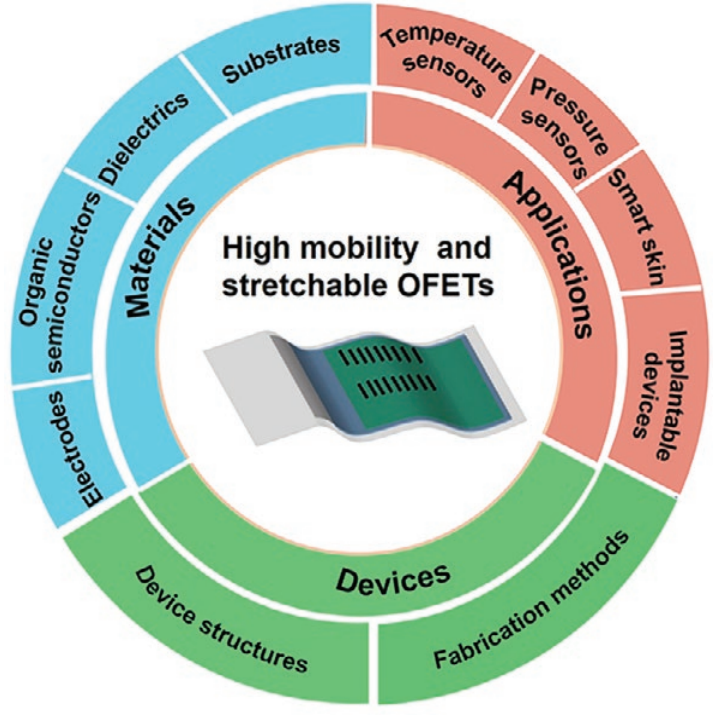 针对上述问题,天津大学理学院杨辉教授课题组联合分子聚集态科学研究院纪德洋教授,系统总结了高迁移率可拉伸有机场效应晶体管的最新研究进展。详细介绍了可拉伸有机场效应晶体管核心材料体系的设计与合成,包括高迁移率可拉伸半导体材料、可拉伸绝缘层材料和可拉伸电极材料;总结了高迁移率可拉伸有机场效应晶体管阵列的各种器件结构和制造技术;概述了高迁移率可拉伸有机场效应晶体管在温度传感器、压力传感器、智能皮肤和可植入医疗设备等领域的应用现状;提出了高迁移率可拉伸有机场效应晶体管领域未来的研究方向和面临的挑战。