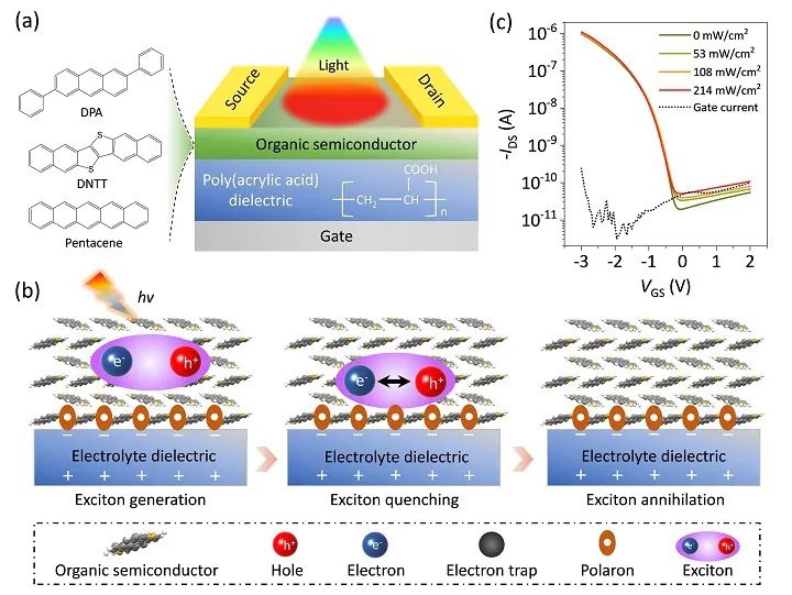 极化子的密度决定着极化子—激子淬灭效率。采用具有双电层电容性质的聚合物电解质材料(聚丙烯酸)作为有机晶体管的介电层,该介电层在栅电压作用下发生电离。相应的离子在电场驱动下迁移到介电层/半导体界面,在有机半导体中诱导出高密度电荷。同时,在异性离子的库伦力作用下,大量的电荷被静电束缚在介电层/半导体界面上形成界面极化子。如图3所示, 高密度界面极化子能够高效淬灭光生激子,淬灭效率高达70%。该策略具有优异的分子普适性,有机晶体管的耐受光强最高可达214 mW/cm2,有效抑制了有机半导体的本征光电响应 。相关工作发表于 ACS Applied Materials & Interfaces 。 [2]