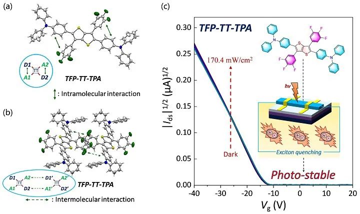 图2. 本征光稳定有机半导体分子TFP-TT-TPA和光稳定晶体管