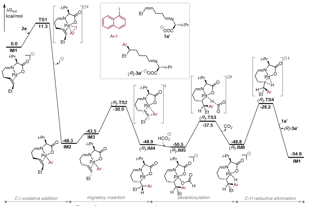 在该项研究中黄跟平课题组通过DFT计算结合控制实验对反应机理进行了深入的阐释同时解释了对映选择性的来源(图6)。计算表明,尽管 C-H 还原消除的能量高于迁移插入,但由于脱羧非常容易且不可逆,因此反应的对映选择性应由迁移插入步骤决定。