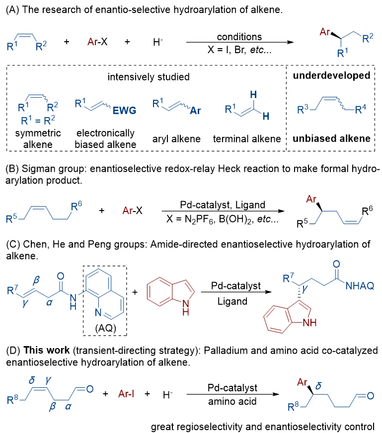 开发构建Csp2-Csp3键的新方法对于合成药物分子和天然产物具有重要意义。烯烃的氢芳基化由于避免使用金属试剂,并具有良好的官能团耐受性而受到广泛研究。除了分子内反应外,烯烃的范围主要局限于对称烯烃、电子偏向烯烃、芳基烯烃或末端烯烃(图1)。Sigman课题组开发一系列了无偏烯烃的对映选择性氧化还原-relay Heck反应,陈弓、何刚、彭谦等人报导了钯催化酰胺导向的烯烃高选择性氢化反应,而无偏烯烃的对映选择性氢芳基化是对区域选择性控制的挑战,它可以构建一个孤立的手性中心,但目前还不成熟。