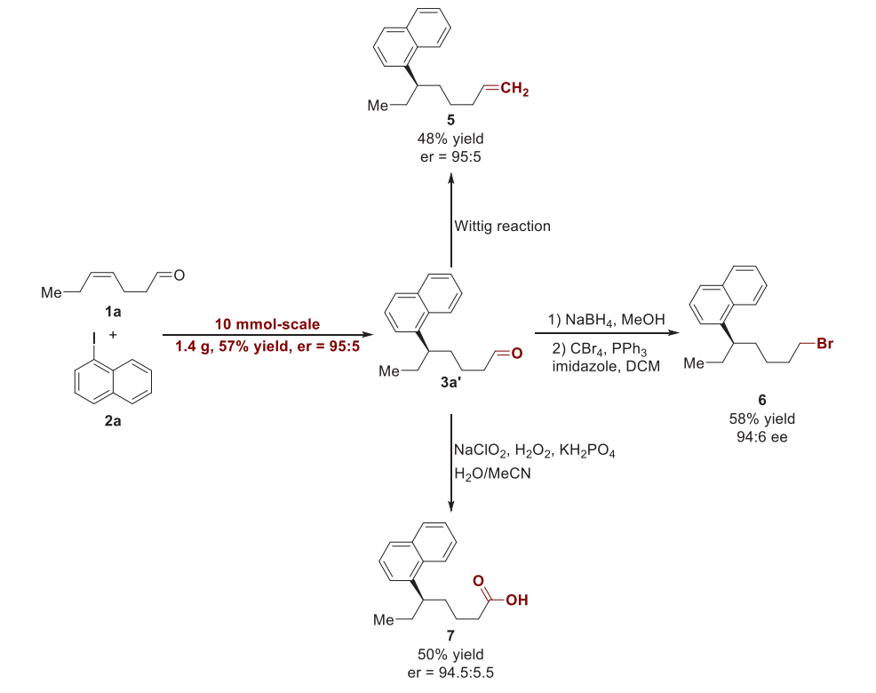随后,作者对反应进行了克级规模的实验。对于产物的醛基基团,作为通用的有机合成中间体,作者进行了多种转化,例如通过Wittig反应转化为末端烯烃,通过两步反应将C=O双键转化为C-Br键,也可以将产物醛氧化为酸,重要的是,所有进一步转化都能很好地工作,而不会减少产物醛中原来孤立的手性中心的er(图4)。