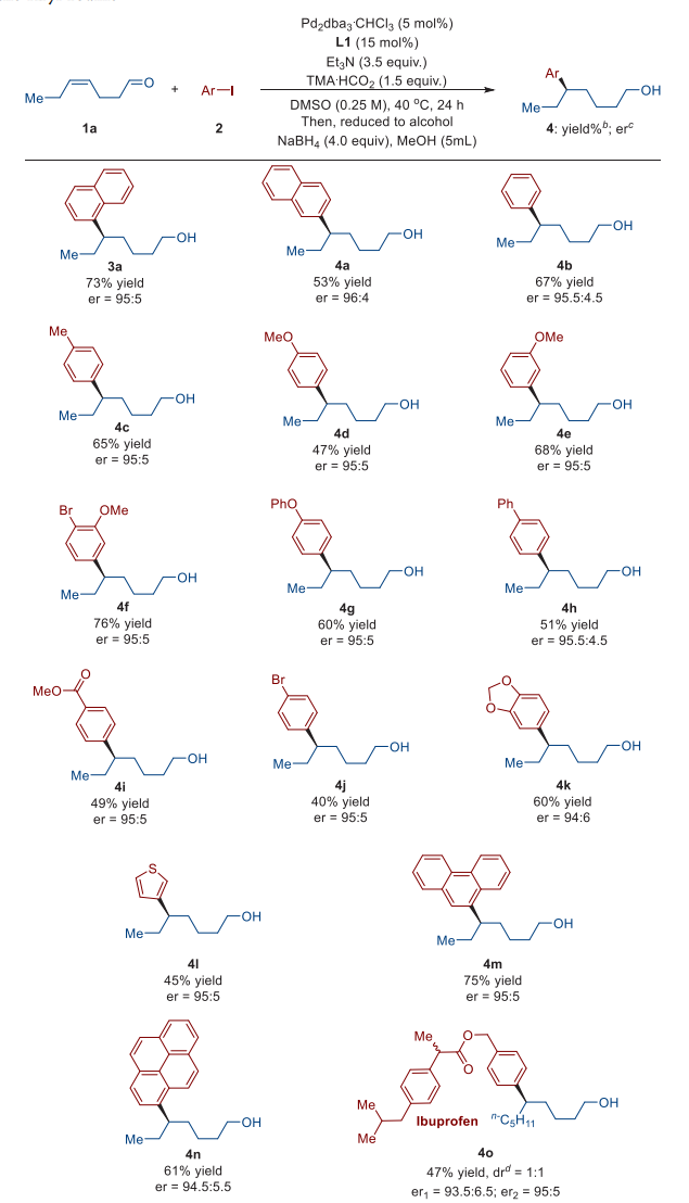 之后,作者将底物范围进一步扩大到多种芳基碘化物(图3),结果表明,具有供电子基团(甲基、甲氧基和苯氧基)和吸电子基团(酯和溴)的起始原料具有良好的产率和高对映选择性,同时杂环底物可以顺利转化为相应的产物。值得注意的是,所有上述转变都具有很高的区域选择性,提供了没有γ异构体的δ产物。