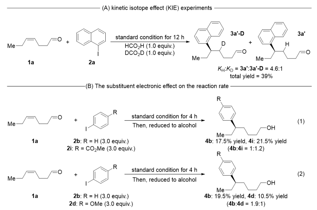 为了研究反应机理,作者设计了动力学同位素效应(KIE)实验和竞争实验(图5)。在低转化率下,当HCO2H与DCO2D混合进行12 h的氢化反应时,可以得到理想的KH:KD = 4.6:1的产物,这一结果表明,在本实验中,C-H/D键形成的步骤是决定产物的。此外,竞争反应表明苯环与吸电子基团可以优先参与反应,证明芳基碘上的吸电子基团能够加速产物决定步骤。
