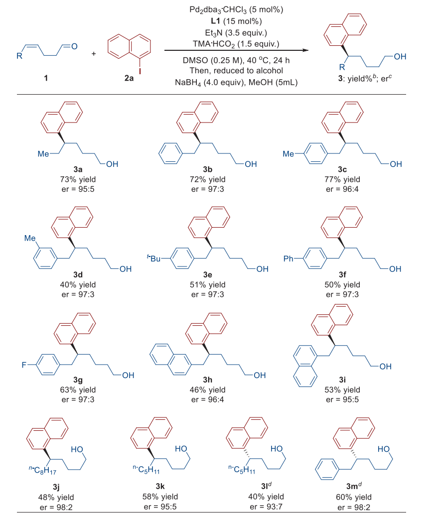 为了探究该方案的可行性,作者选用(Z)-4-庚烯醛为底物,Pd2dba3.CHCl3作为催化剂,L-缬氨酸作为配体,TMA.HCO2作为氢源,1-碘萘作为氧化剂,烯烃的对映选择性氢化芳基化可以顺利完成,经过条件筛选,能够以73%的产率和95:5的er获得目标产物。在底物扩展过程中发现,该反应可以用于合成广泛存在于各种药物分子中的1,2-二芳基结构,对于烯烃底物上各种电性的芳基取代基,反应都能较好的兼容。此外,延长的烷基链并不影响反应的进行。值得注意的是,当(E)-alkenes作为起始原料时,反应仍能顺利进行以提供相反构型的产物(图2)。
