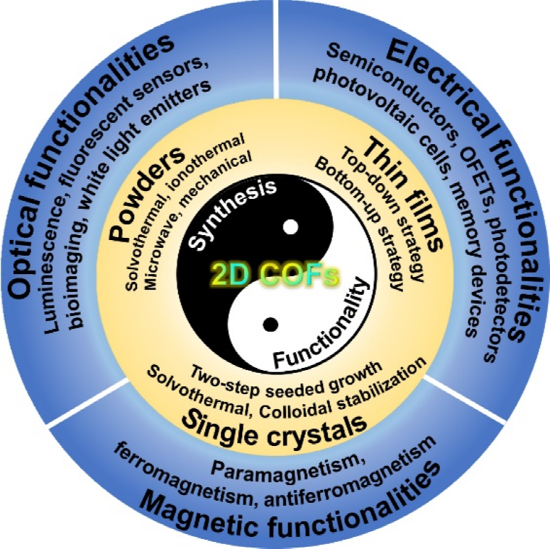 图1. 该综述系统总结了2D COF粉体、单晶、和薄膜的合成及其先进的光学、电学和磁学功能的研究进展