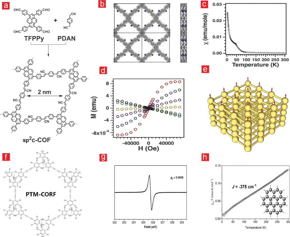 近年来,自旋电子器件作为一项新兴技术,受到了人们的广泛关注。自旋排列的有效调控对于构建高性能的自旋电子器件非常重要。据报道,自由基能够被引入到化学稳定的2D COFs骨架中,并能够实现不同的自旋排列,包括铁磁性,反铁磁性,和顺磁性 (图7)。2D COFs的磁性主要来源于未配对电子的相互作用。