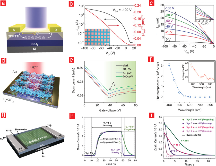 图6. 2D COFs的电学应用,包括场效应晶体管,光探测器,记忆器件等.