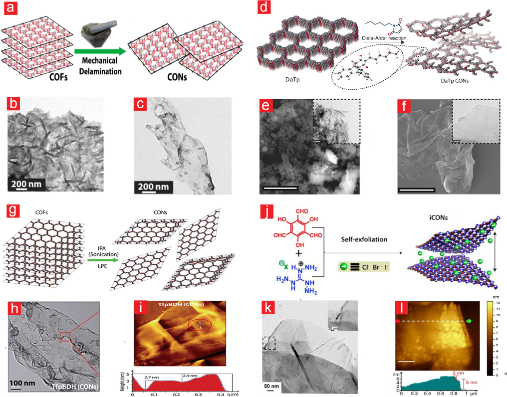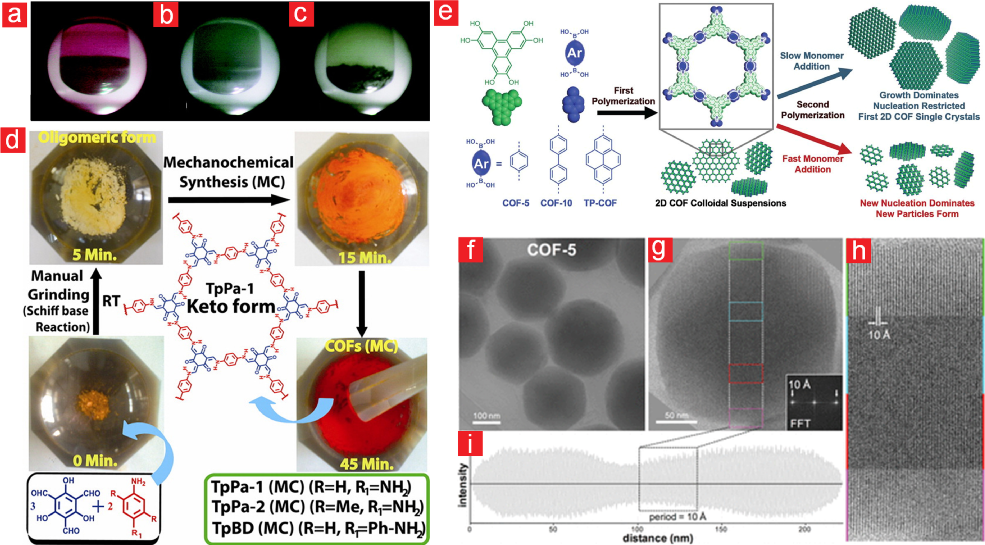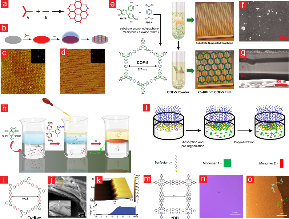 该综述首先总结了2D COFs粉末和单晶的合成方法 (图2)。其中2D COFs粉末的合成方法包括溶剂热合成,离子热合成,微波合成和机械合成。2D COFs单晶的合成策略包括种子生长法、胶体稳定法和溶剂热法。