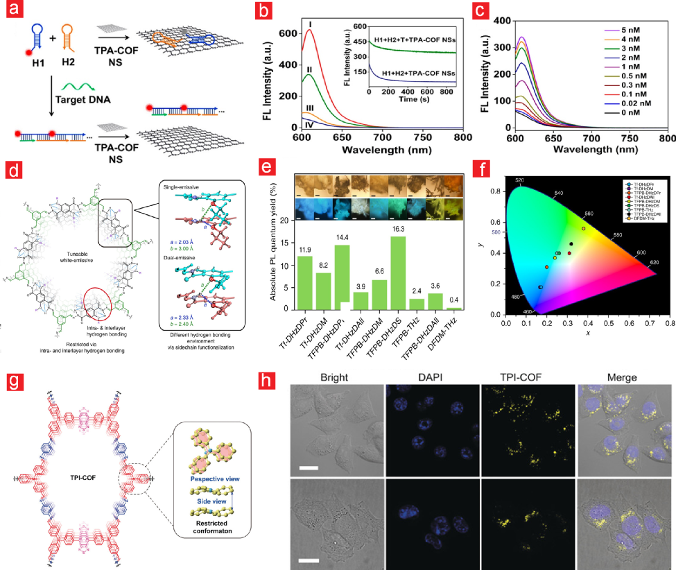 图5. 2D COFs的光学应用,包括荧光传感,白光发射,以及生物成像等
