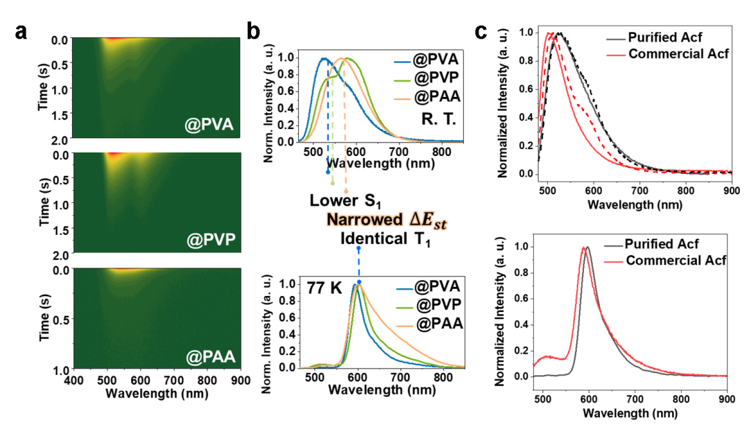 图3 (a) 吖啶黄在PVA、PVP及PAA基质中的时间分辨延迟发光光谱。(b) 吖啶黄在PVA、PVP及PAA基质中室温下(上)及77 K(下)的延迟发光光谱。(c) 经纯化的吖啶黄和商品化的吖啶黄产品制备而成的PVA薄膜在室温下(上)及77 K(下)的延迟发光光谱。