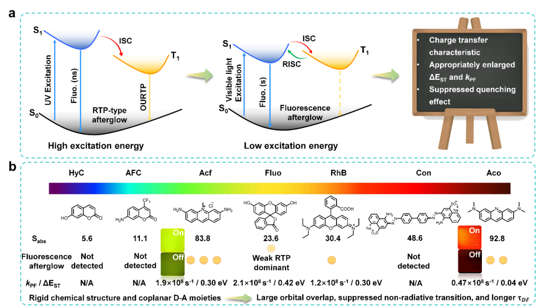 图1 (a) 可见光激发的荧光长余辉材料的构筑策略。(b) 不同荧光染料的光物理性质。