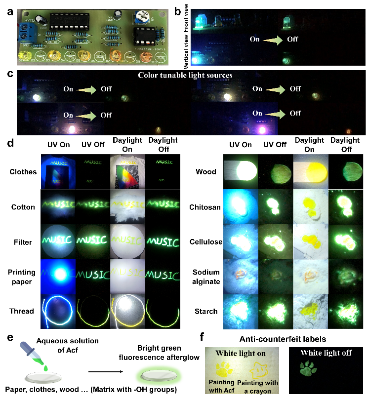 研究者还通过将罗丹明B加入吖啶黄薄膜,利用能量转移过程,增强了其荧光余辉发射。如图4所示,加入罗丹明B后,余辉光谱出现了罗丹明B的特征峰,CIE色坐标图清晰地展现出加入不同质量分数罗丹明B后余辉颜色的改变。停止白光激发后,可观察到从绿色到橙红色变化的荧光长余辉发射,最大荧光量子产率可达42.4%。基于材料可见光激发产生不同颜色余辉发射的特点,研究者成功实现了颜色可调的照明光源开发。利用定时器,停止供电后可观察到不同的余辉颜色(图5a-5c)。而将吖啶黄水溶液与多羟基基质结合,可制造发夜光的工业品,比如含有多羟基基质的衣服、棉花、纸、木材和淀粉等(图5d)。利用这种荧光长余辉材料构筑的一般策略,还可以在包装箱上绘制可见光识别的防伪标签,2美元的成本可以实现超过5万个大小为2 cm×2 cm防伪标签的绘制。只有用吖啶黄水溶液绘制的标签在关闭白灯后可展现出绿色余辉。该论文第一作者是天津大学分子聚集态科学研究院博士生王家强,通讯作者是李振教授,共同通讯作者为天津大学生命科学院张丽瑶副教授,该研究得到国家自然科学基金和武汉光电国家实验室开放项目的支持。